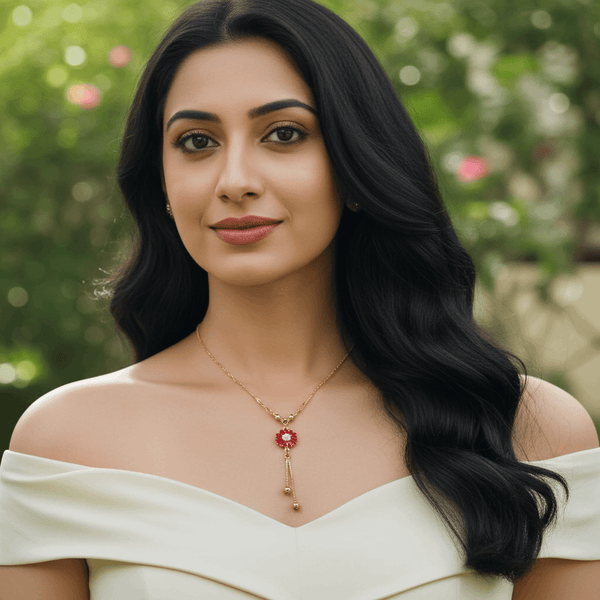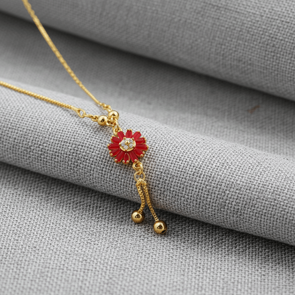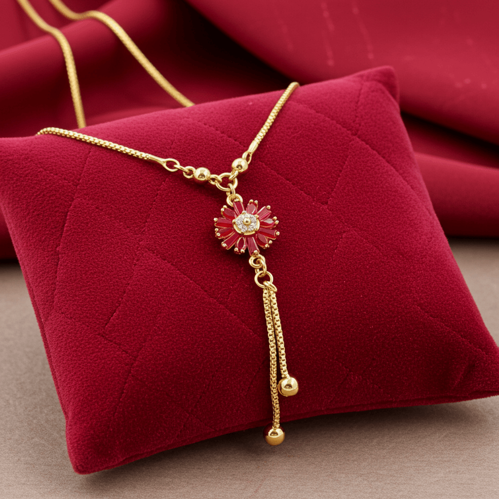 Ignite your style with our stunning Red Floral Tassel Pendant. This eye-catching gold-plated piece features a radiant bloom crafted from rich, ruby-red baguette crystals, and is finished with a graceful, dangling tassel for a touch of dramatic elegance.
