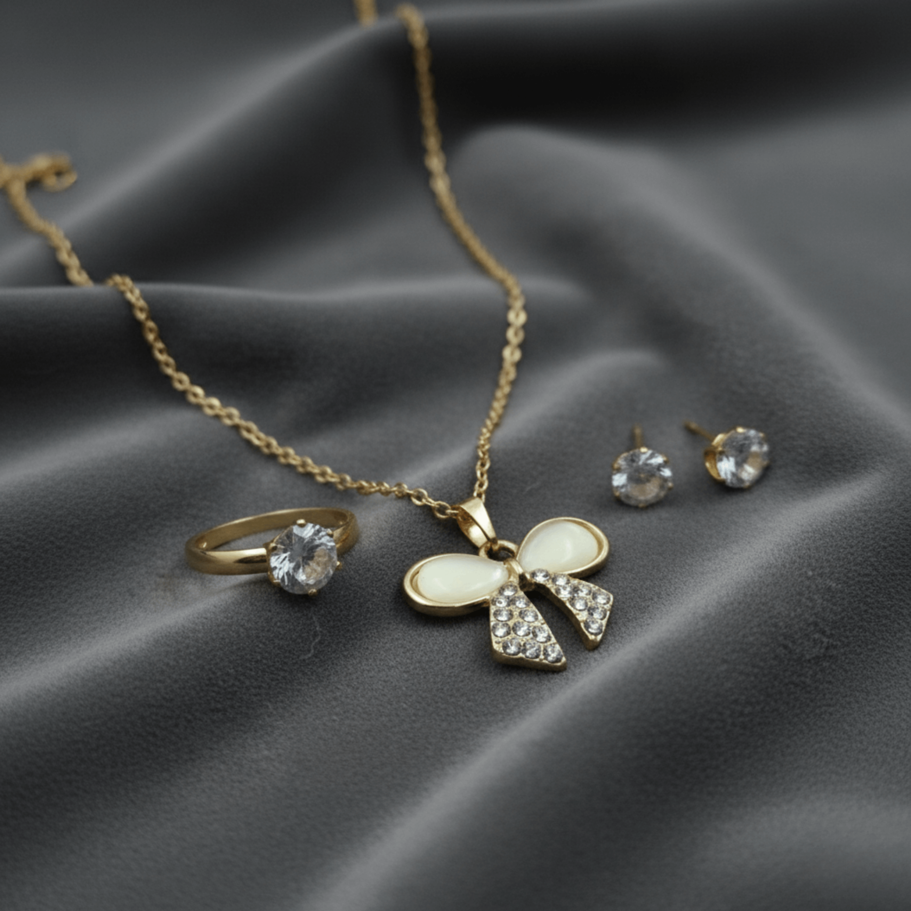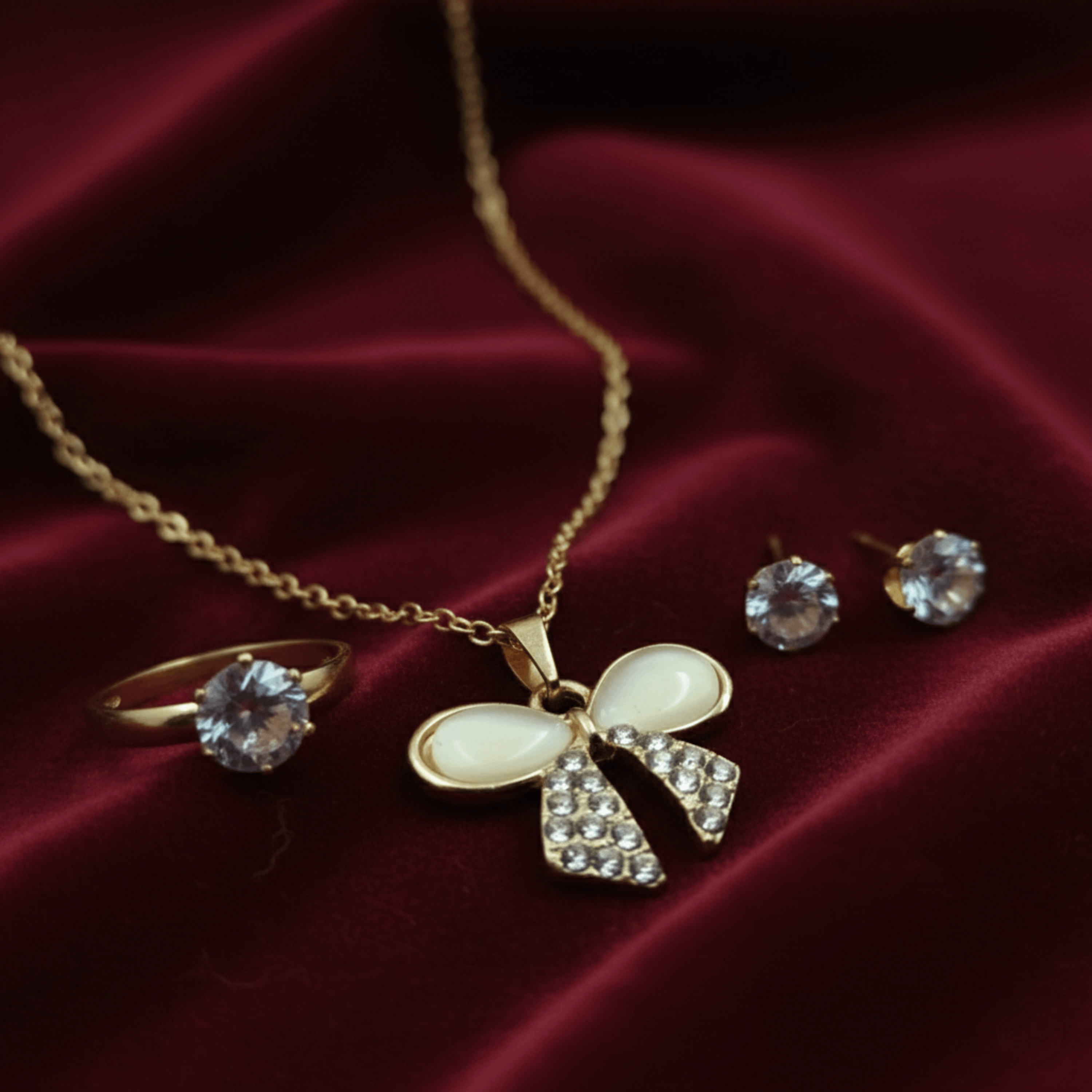 Adorn yourself with the perfect finishing touch with our Dainty Bow Pendant Set. This charming gold-plated collection features a lovely bow that elegantly contrasts serene moonstone with glittering crystals for a look of pure sophistication.