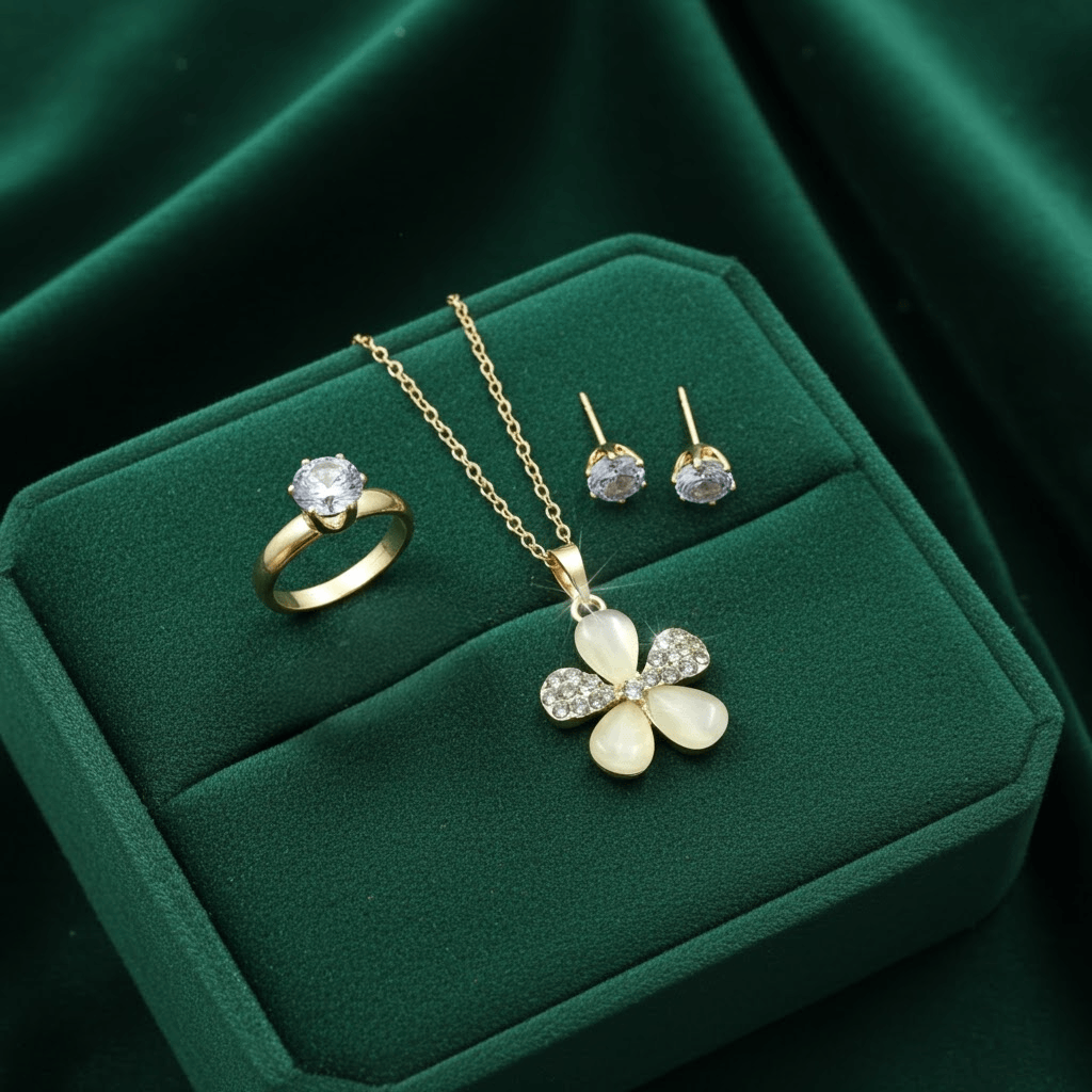 In the Box: 1 Pendant with Chain, 1 Pair of Earrings, 1 Ring