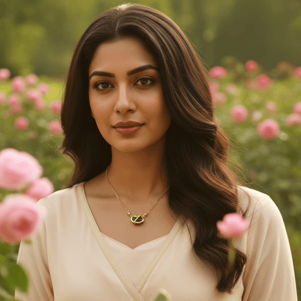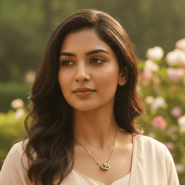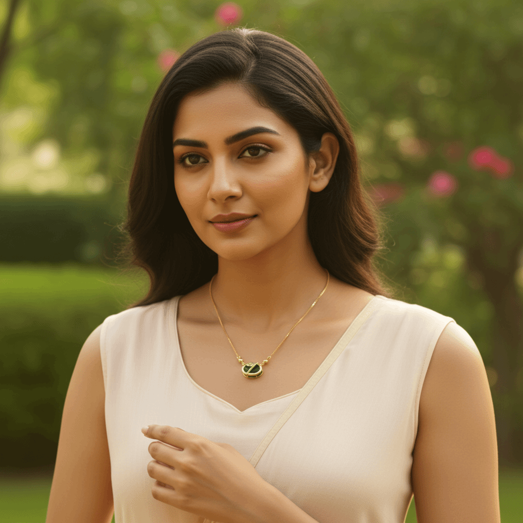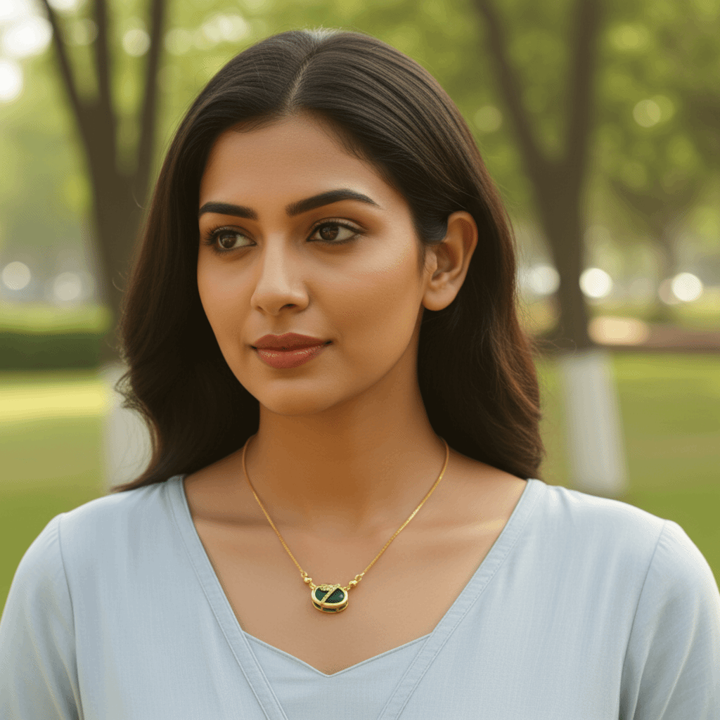 Grace your neckline with the deep, captivating beauty of our Emerald-Green Pendant. This exquisite gold-plated piece features a stunning, richly coloured stone, elegantly swept with an arc of sparkling crystals for a touch of modern sophistication.