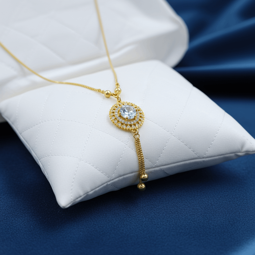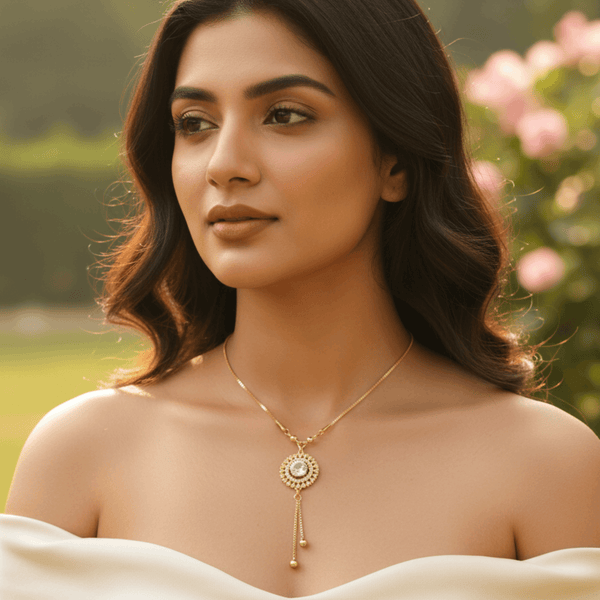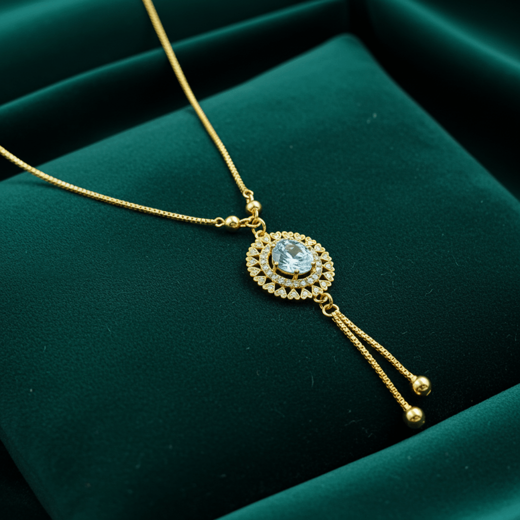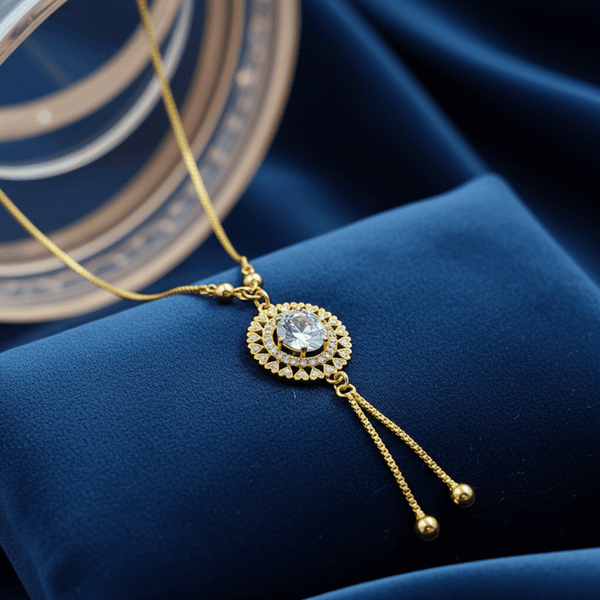 Channel timeless sophistication with our stunning Golden Tassel Pendant. This exquisite piece features a brilliant, oversized solitaire at its heart, framed by a halo of sparkling crystals and finished with delicate dangling tassels for a touch of classic glamour.