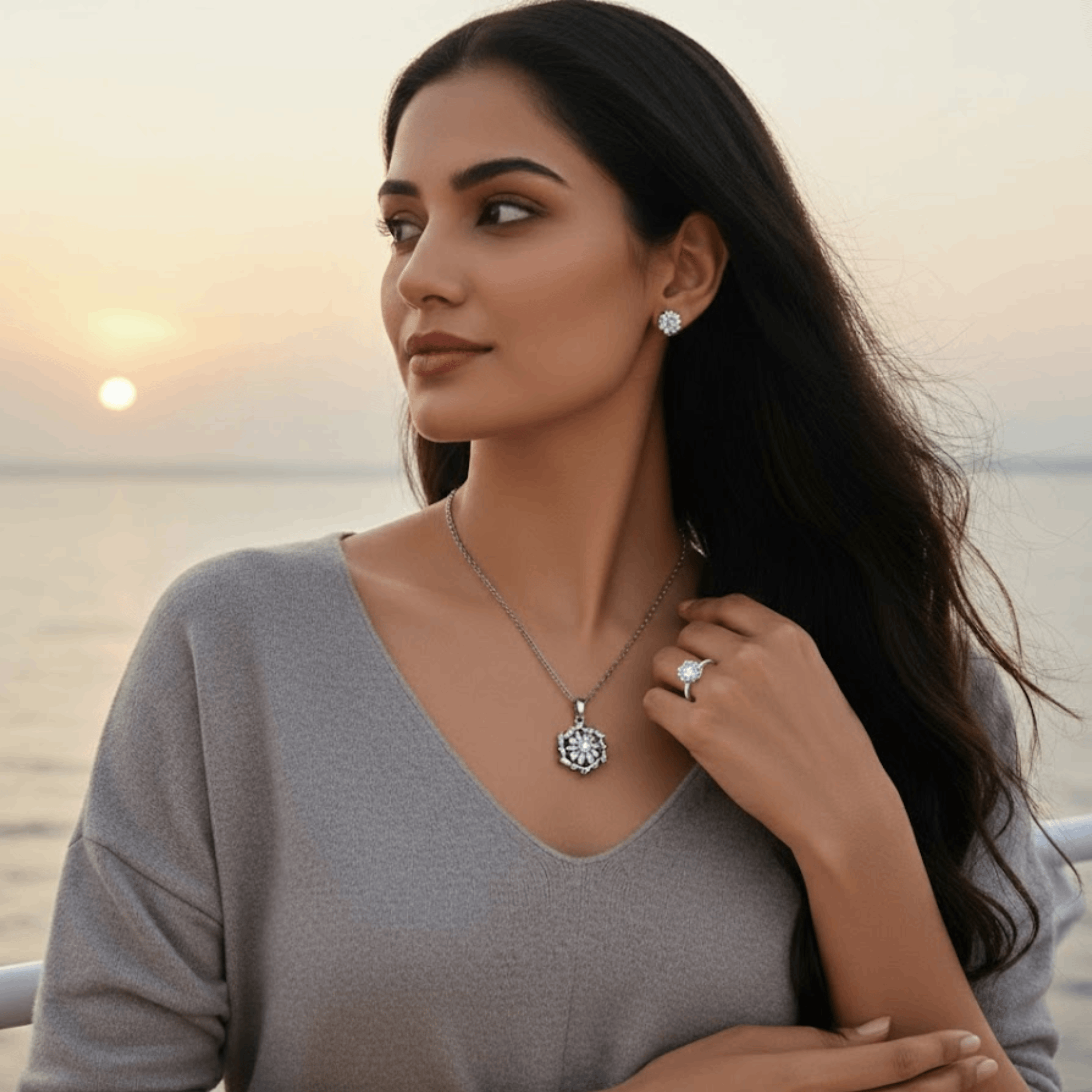 In the Box: 1 Pendant with Chain, 1 Pair of Earrings, 1 Ring