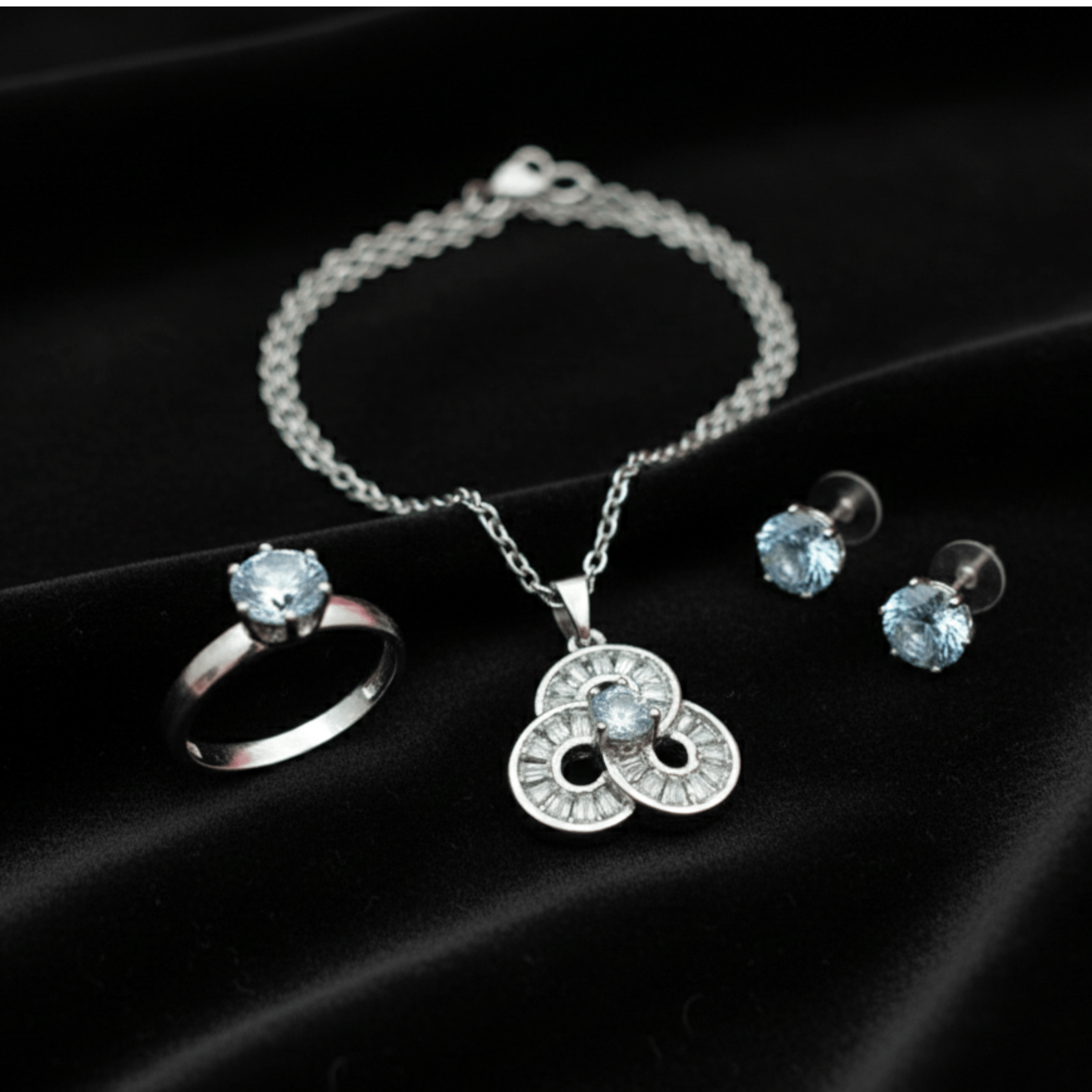 In the Box: 1 Pendant with Chain, 1 Pair of Earrings, 1 Ring