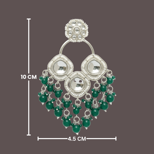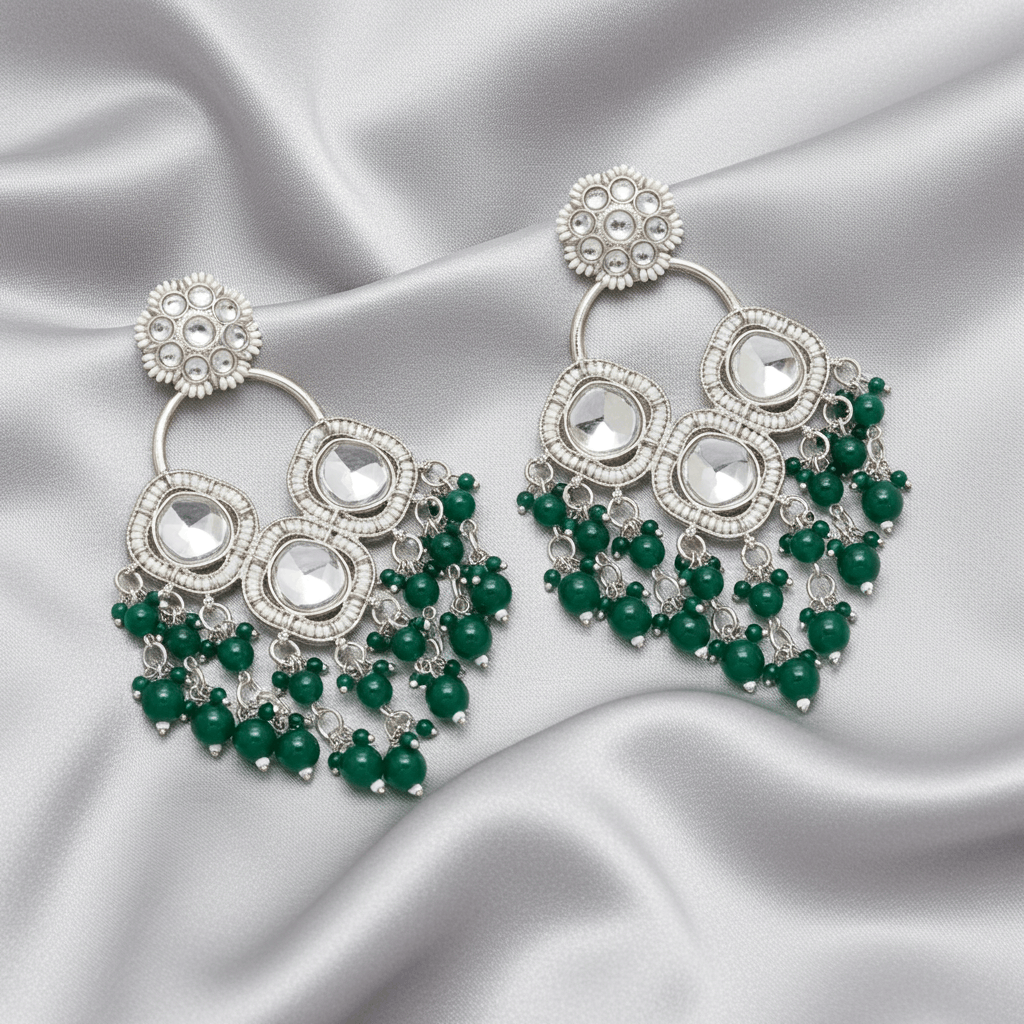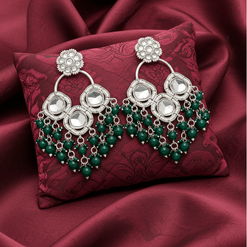 Tessara Silver-Plated Kundan Chandelier Earrings with Bottle Green Bea