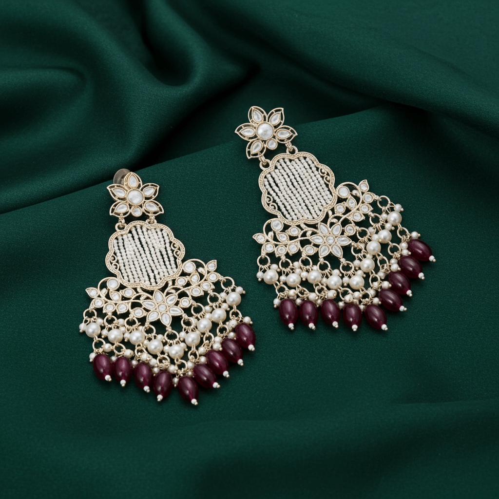 Add a touch of sophistication to your ensemble with our Elegant Kundan Chandelier Earrings with White & Wine Beads -by Tessara