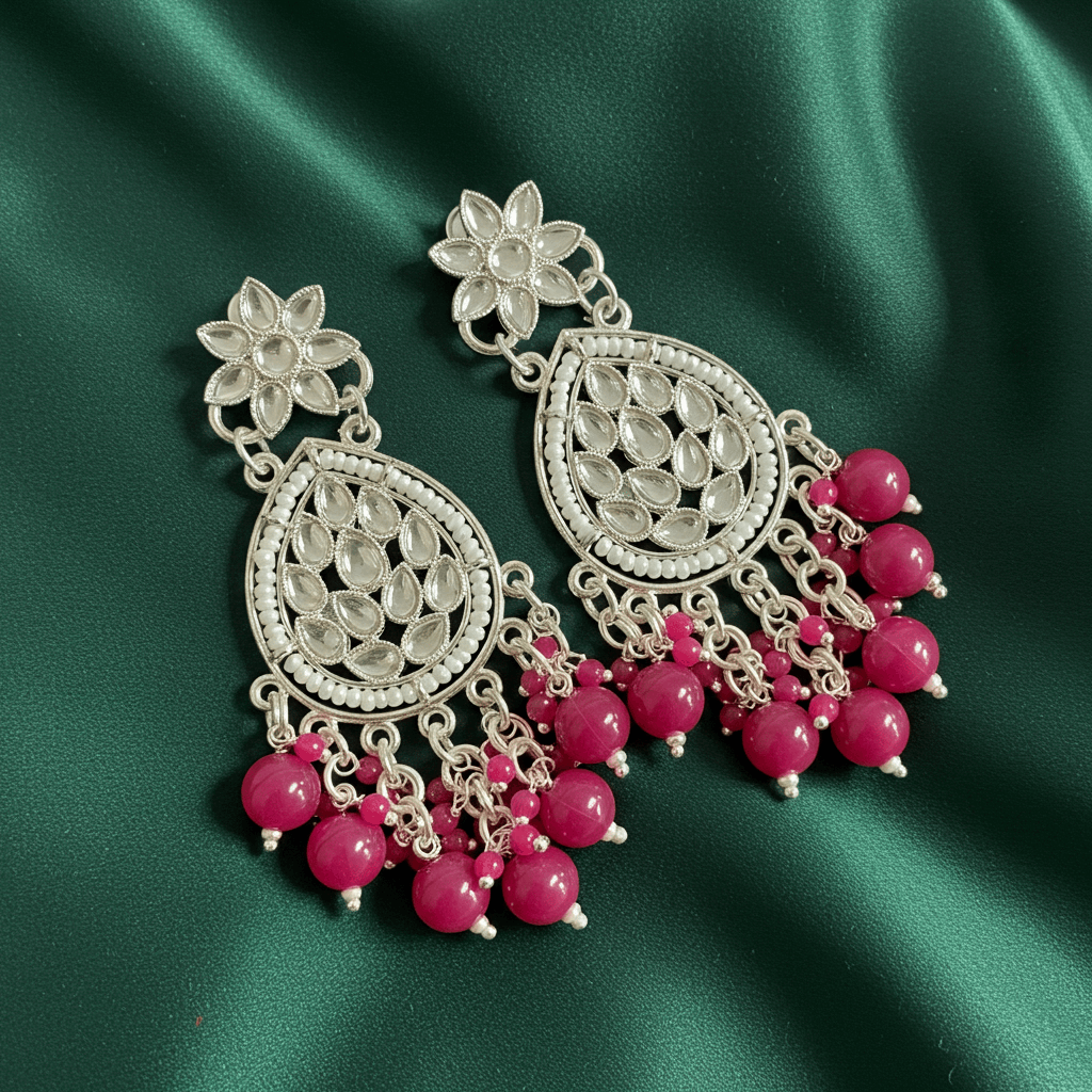 Tessara Silver Kundan Teardrop Danglers with Rani Pink Beads