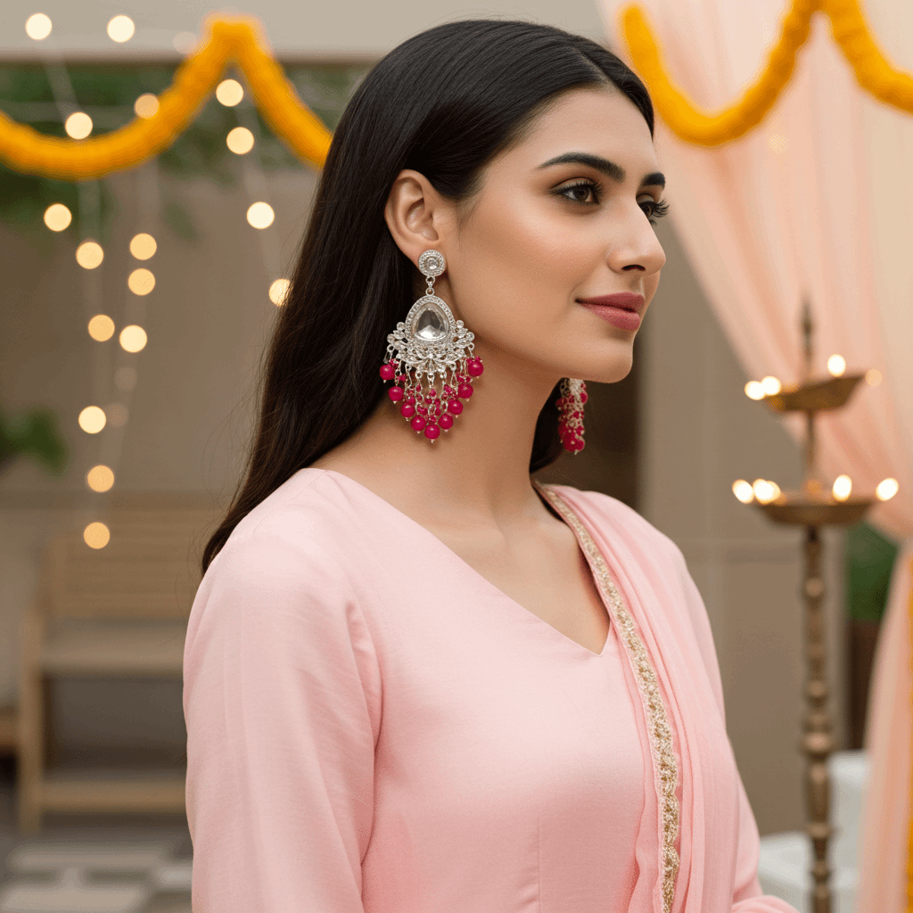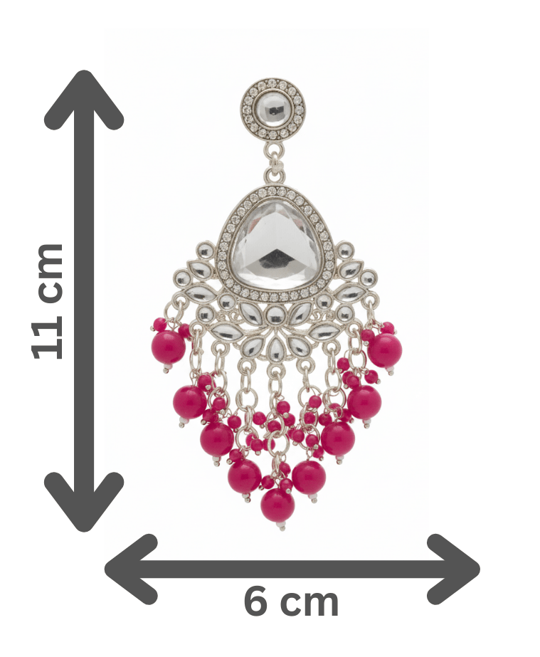 Add a touch of sophistication to your ensemble with our Silver-Plated Kundan Chandelier Earrings with Ruby Pink Beaded Drops -by Tessara