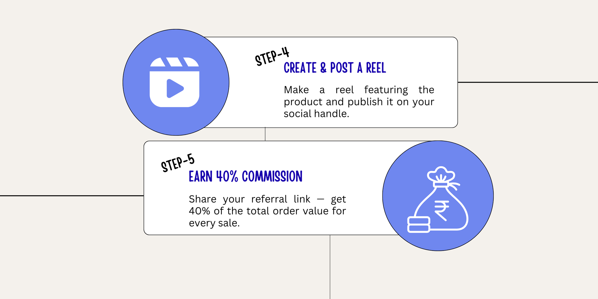 After your reel is live, we’ll share your unique referral link. Every time someone buys through your link, you’ll earn 40% of the total order value.