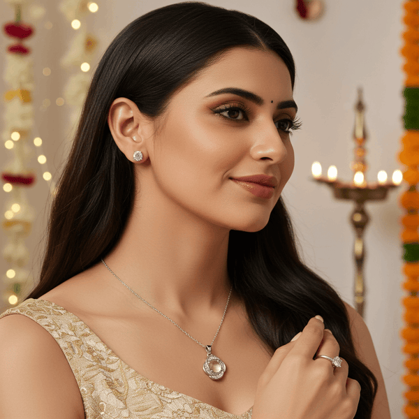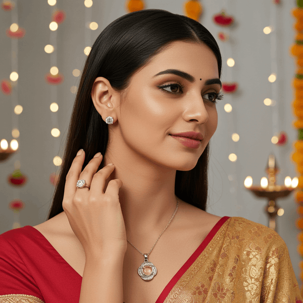 Tessara Silver-Plated Translucent Stone Floral & Solitaire Pendant Set with Ring