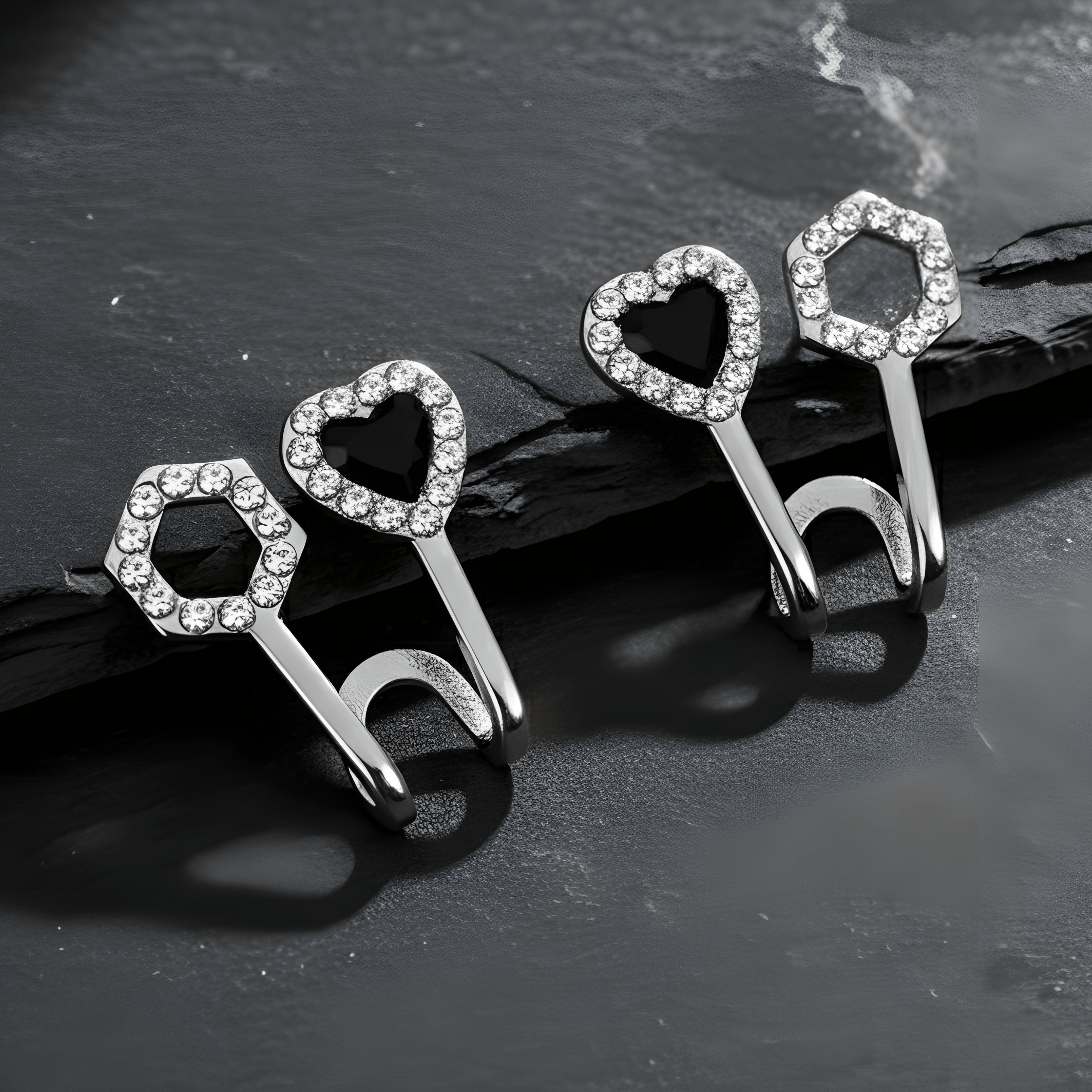 Redefine your ear stack with our stunning Geometric Cuff Earrings in a brilliant silver-plated finish. This unique pair features a bold double-stud design, contrasting a sparkling crystal hexagon with a black stone heart, for a look that's effortlessly cool and chic.